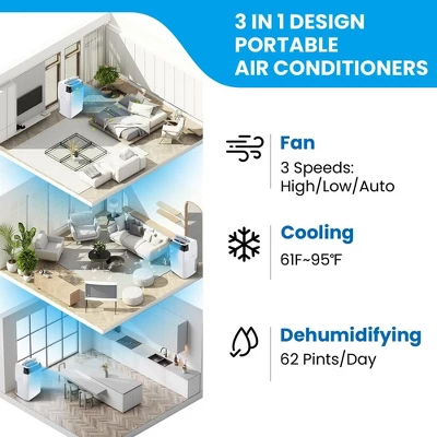 - 【Versatile 3-in-1 Functions】: This Portable Ac Unit Combines Cooling, Fan, And Dehumidifying Functions, Allowing You To Adjust Temperatures From 61℉ To 88℉ In Cooling Mode. With A Dehumidifier Capacity Of 80 Pints/day, It Effectively Reduces Room Humidity, While The Power Cooling Fan Ensures Continuous Fresh Air Circulation.
