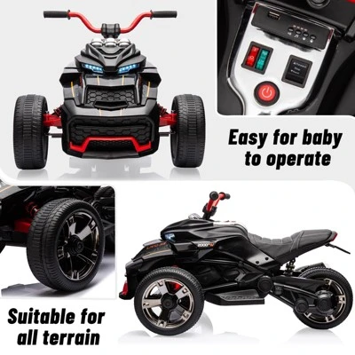 12V 3 Wheeler Ride On ATV Electric Motorcycle, Battery Powered Electric Vehicle w/Led Lights, High & Low Speed, Horn, Music, USB, Treaded Tires, Ride On Car for Kids Gift