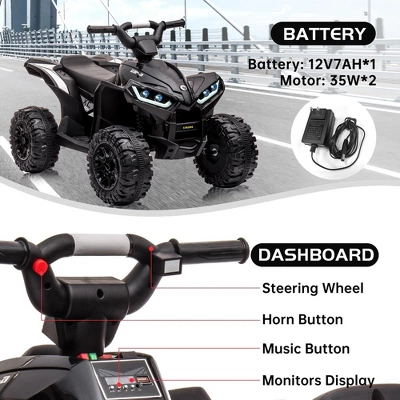 12V Kids Ride On ATV, 4 Wheeler Electric Vehicle for Toddlers, Battery Powered Motorized Quad Toy Car for Boys Girls with LED Lights, Music, High Low Speed, USB, Soft Start, Treaded Tires