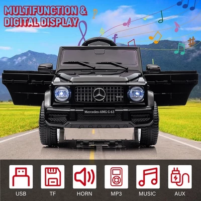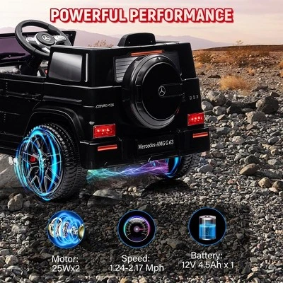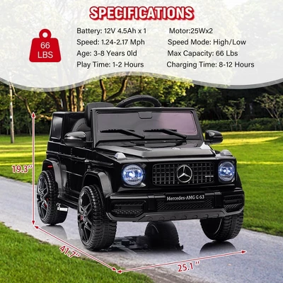 Official Mercedes-Benz G63 12V Kids Ride-On CarThis luxury SUV-style electric car delivers premium driving fun with:✓ Parental 2.4G remote control + manual steering✓ Realistic LED headlights & Mercedes badging✓ 4-wheel suspension for smooth rides✓ Bluetooth music & horn for interactive play✓ Safety features: Soft-start acceleration + seat beltPerfect for ages 3-6 (66lb max). Official licensed product.