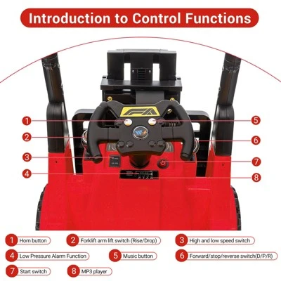 - Interactive Features: This ride-on forklift comes equipped with built-in music, speed change switch, forward and backward switch, horn button, USB, and MP3 slot for playing music. These features offer a range of entertainment options for kids, ensuring that every ride is filled with fun and excitement.