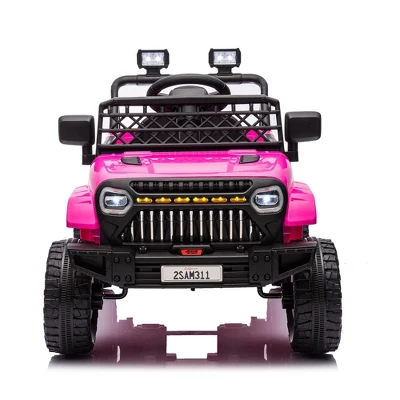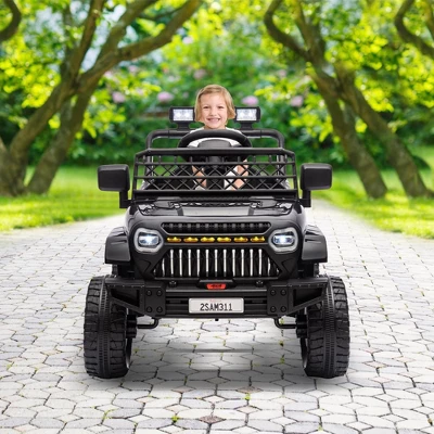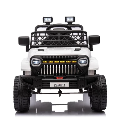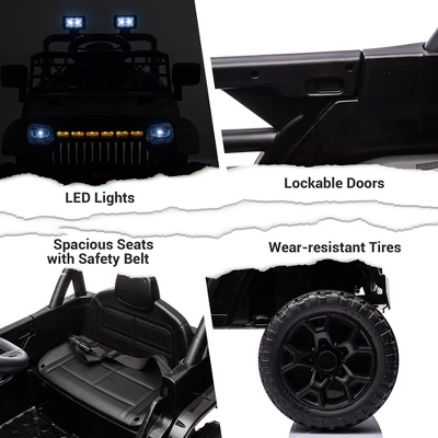 - Realistic Driving Experience: This electric truck features bright LED headlights, lockable doors, and a grid windshield for an authentic off-road style, providing children with a true driving experience. The one-button start makes it easy to operate, while the adjustable seat belt ensures the safety of your kids. With four stable spring suspension systems, your child will enjoy a smooth and comfortable ride in this kids’ ride-on truck.