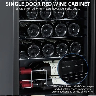 - Ample Space: Boasting a spacious capacity of 32 bottles, the wine cellar offers the perfect solution for a diverse wine collection. The removable shelves enable you to adjust shelf heights to accommodate bottles and cans of different sizes in upright or flat positions effortlessly. Whether you’re a wine connoisseur or collector, it provides ample room to display and age your favorite wines.