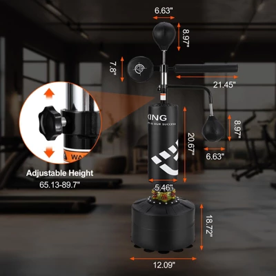 - Boxing Bag for Beginners: The height of the boxing bag can be adjusted according to your height and force point preferences. Height range is 63″ – 90.5″, ideal for beginners and kids.