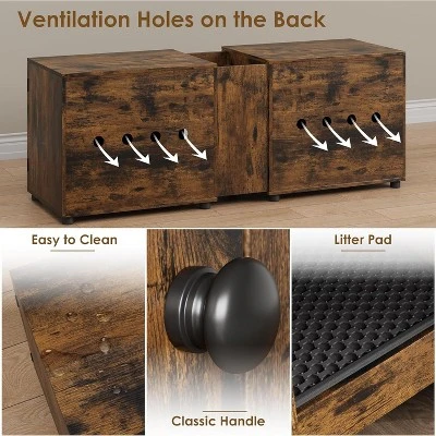 - Spacious Storage Solution🐈️🐈️ This oversized litter box enclosure provides two large cabinets—each measuring 17.7”D x 22.4”W x 17.7”H—offering plenty of space for most standard litter boxes. The cubby above the entrance serves as a convenient spot for storing cat food, toys, and supplies, while the top surface can display decorative items or small plants, enhancing the overall aesthetic of your home.