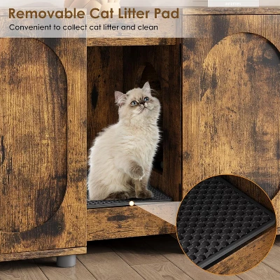 - Tidy and Odor-Free🐈️🐈️ Say goodbye to stray litter and unpleasant odors. This enclosure features a high-quality litter mat in the middle section, designed to trap debris as your cat exits the box. By keeping litter contained, your floors stay cleaner and your home smells fresher. The addition of double roller catches ensures the cabinet doors remain securely closed, preventing curious cats from accessing the compartments.