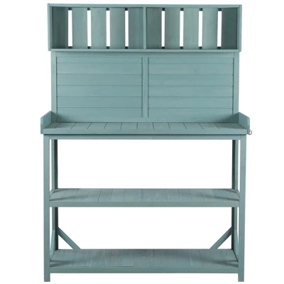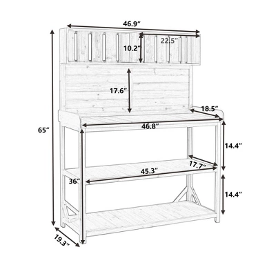 - [Perfect Workstation]: Embrace the upcoming Spring season with this charming farmhouse garden potting bench. Crafted from 100% fir wood, this table provides a sturdy outdoor workstation measuring 46.8×18.5 inches, offering ample space for your gardening tasks.