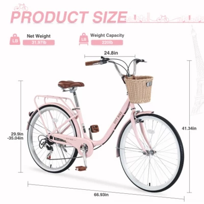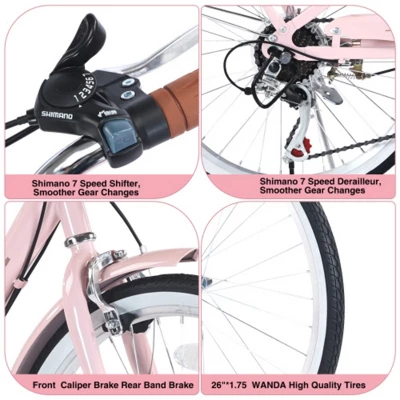 Bicycle for grils combines the features of a comfort bike and a commuter bicycle, comes 85% assembledShimano 7-speed Shifter and derailleur riding from leisure to long distance commutesCity-style 26 inch wheel size and 15 inch steel frame Low swooping frame makes for easy step-thru entry on and off the bike.Brown leather saddle and Comfortable grips , 26*1.75 WANDA high quality Tires provide excellent roll, and a cushioned, stable rideFront caliper brake and Rear band brake ,double brakes more softer and faster braking response