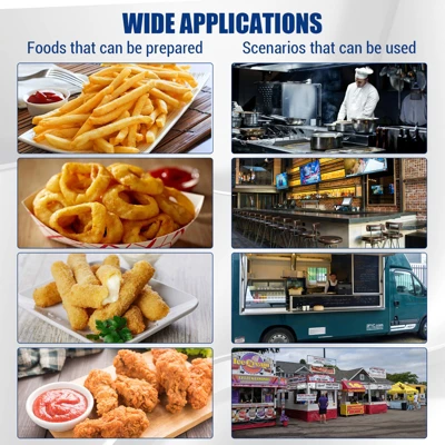 Name: Commercial Deep Fryer Color: Silver Material: Stainless Steel Size: 6.3 QT/ 6 L with Single Basket: 10.6 x 16.5 x 11.6 inch 6.3 QT/6 L with Double Basket: 21.6 x 16.5 x 11.6 inch 8.4 QT/8 L with Single Basket: 10.6 x 16.5 x 13.6 inch8.4 QT/8 L with Double Basket: 21.6 x 16.5 x 13.6 inch11.5 QT/11 L with Single Basket: 13 x 17.7 x 13.5 inch11.5 QT/11 L with Double Basket: 26.5 x 17.7 x 13.5 inch
