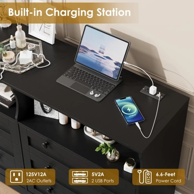 - 【Built-in Power Outlet and LED Light】 Stay connected with the built-in charging outlet on the large dresser’s tabletop, featuring 2 AC outlets, 2 USB ports, and a 6.56-foot power cord. Designed for modern living, this bedroom dresser also includes a multi-color LED light bar with 16 color options and 21 dynamic modes, enhancing the ambiance of any room while providing nearly unlimited customization to suit your style.