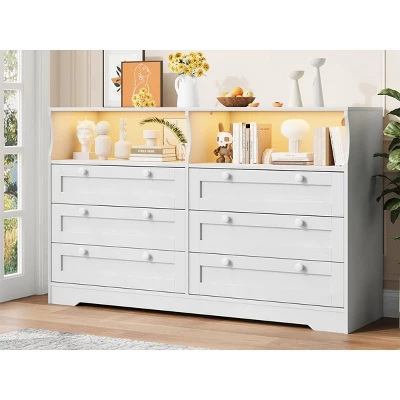 Dresser Chests of Drawers, Wooden 6 Drawer Dresser for Bedroom with Led Light, 55″ Wide Wood Dresser with Large Capacity Storage, Storage Dressers Organizer for Closet, Living Room