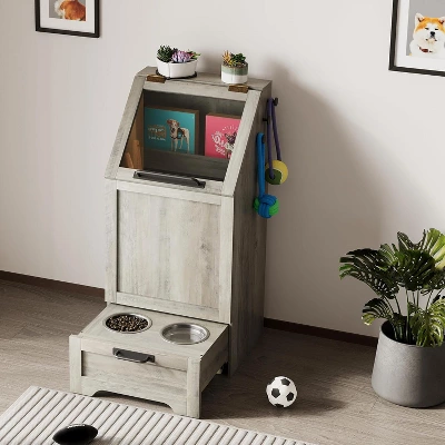 - Stylish and Functional Design: This pet food cabinet features a sleek see-through flip-up top that blends functionality with style, serving as a modern feeding station that stores your pet’s food while enhancing your home decor with practical storage