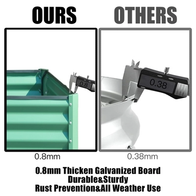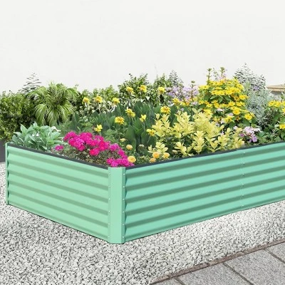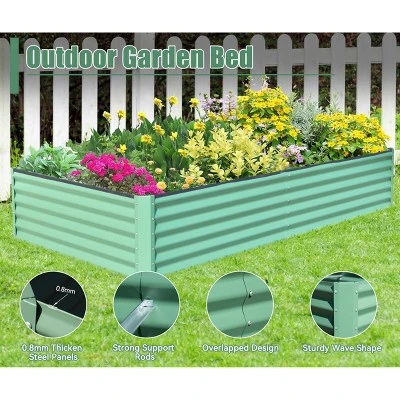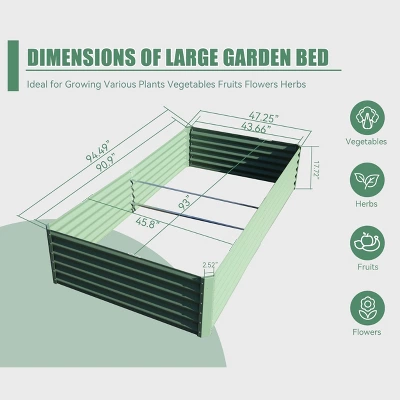 Description:Name: Galvanized Raised Garden BedMain Material:SteelColor:GreenProduct Dimensions:94.49 x 47.25 x 17.72in.Product Weight:45.70lbs.Use Case:Garden & OutdoorNumber of Package:1Package Size:48.43 x 20.47 x 3.35in.Package Weight:48.94lbs.Packing list:1 x Planter BoxSpacious Planting Area: Raised garden beds offer extensive space for cultivating a variety of vegetables, herbs, flowers, and more. Their generous depth and width facilitate optimal root growth, leading to healthier plants. Sturdy Galvanized Steel Construction: Crafted from powder-coated galvanized steel, these outdoor planter boxes are built for durability and rust resistance, ensuring they last for many seasons. Open Base for Enhanced Soil Quality: The garden bed features an open base, making it ideal for composting yard waste and food scraps to create rich soil. This design ensures proper drainage, avoiding excess water buildup and preventing root rot. Strong Support Structure: Fitted with sturdy support rods, this raised garden bed offers exceptional stability and prevents the sides from bowing outward, ensuring the structure remains strong and intact. Reinforced Safety Edge: The garden planter box includes a thickened safety edge, enhancing safety during gardening tasks and minimizing the chance of accidental cuts or injuries.