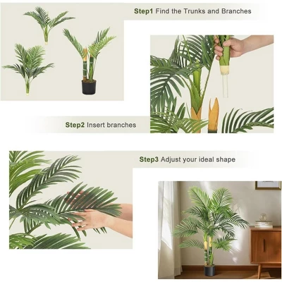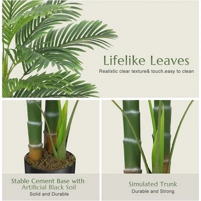 This artificial golden cane palm tree is designed to realistically mimic a natural palm, featuring a detailed trunk and 14 large fronds with feather-like leaves and moss-covered soil.It comes pre-potted in a heavy-duty plastic and concrete base for stability, making it safe for children and pets. The tree requires assembly and can be reshaped for a fuller look, thanks to adjustable metal wires in the branches. It is housed in a 6″ non-decorative black pot, which can be placed in a larger decorative planter for added style.Maintenance is minimal, as the tree requires no watering or pruning and retains a fresh appearance year-round. Made from high-quality PVC and PE, the trunk and leaves are durable and resistant to fading.This lifelike palm is versatile and suitable for both indoor and outdoor settings, including balconies, gardens, and various rooms in your home, as well as commercial spaces like coffee shops and bookstores.