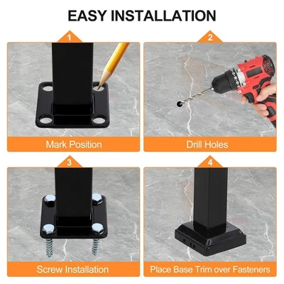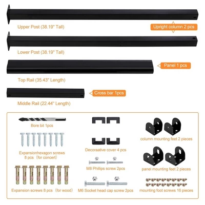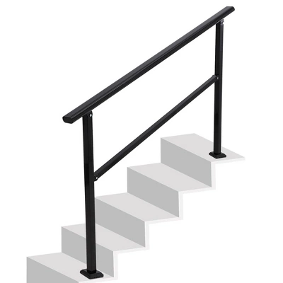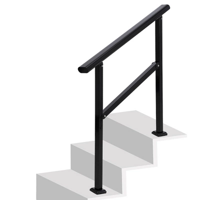 Adjustable Handrail: Suitable for 1 or 4 stepsand horizontal surfaces.Adjust the middle rail to make two posts vertical to the ground. Max height for steps: 20.87″/53 cm, posts height :38.19″/97cm , upper post length 51.18″/130cm, distance between posts: 38.58″/98cm. Delicate Design: Circular design makes your grip more comfortable.The one-piece design of the handrail end prevents water from entering the interior and avoids rusting. Handrail steps features a smooth powder-coated surface with chic black, which allows you to clean it with water or cloth easily and quickly. Reliability Connection: New joint design makes the whole thing more stable.Secure hardware connection, providing protection from sharp metal edges.The sturdy and durable hardware offers stability and support, creating a safer environment for use. Easy to Install: The package includes impact drill bits, expansion screws, self-tapping screws, and various other accessories suitable for concrete, wood, and brick floors. Extensive Use: The step railing provides added safety for elderly, children, pregnant women, disabled family members, and individuals recovering from surgery. It can be installed on concrete, brick, and wooden steps of porches, balconies, gardens, residential buildings, hotels, garages, etc. Ihis outdoor railing is perfect for locations where attachment to a wall or structure is not possible.