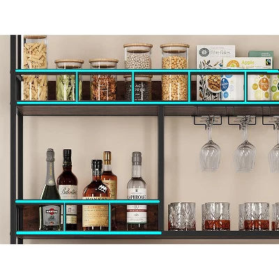 - [Various storage space] Our 5 Tier Bakers Rack features various open storage shelves ideal for keeping kitchen appliances easily accessible, along with a smaller open shelf designed for neatly organizing bottles and cans. The equipped glass holder offers extra space for placing your goblets Additionally, this microwave rack is equipped with a large cabinet, providing dust-proof storage space for food, dishes, or other kitchenware