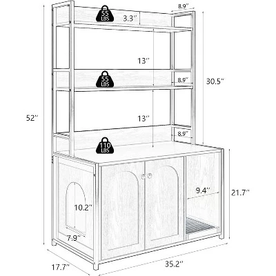 Description:Product Name: Litter box enclosure with 2 storage compartments Hidden litter box furnitureMain Color: Brown/Black/WhiteMain Material: MDF+steelPacking List: Litter box enclosure with 2 storage compartments Hidden litter box furniture x 1Remark:Due to manual measurement, please allow 1-3cm error. Make sure you don’t mind before you bid.Due to the difference between different monitors, the picture may not reflect the actual color of the product. Thank you very much!Practical Cat Book Cabinet: There are 2 layers of spacious shelves on the top of the cat cabinet, where you can place books, cat accessories, cat food and other items. You can make full use of this space to keep your cat’s supplies organized and easily accessible.Hidden Cat Litter Box Furniture: Our cat litter box system can hide the litter box on the shelf. It makes your home look tidy and provides your cat with a hidden toilet area for more privacy and security.Modern House Style: The litter box enclosure is made of wood and a metal frame to ensure stability. The sleek bookshelf design adds elegance to your home. 3 color options are suitable for most interior styles.Suitable For Most Cat Litters: Whether you use a small, medium or large litter box, it can be easily installed in our litter box cabinet.Multifunctional Cat Furniture: This cat cabinet with storage function is not only a cat house or hidden litter box, but also can be used as a bookcase and storage shelf in the living room, laundry room, etc., making your home tidy and comfortable.