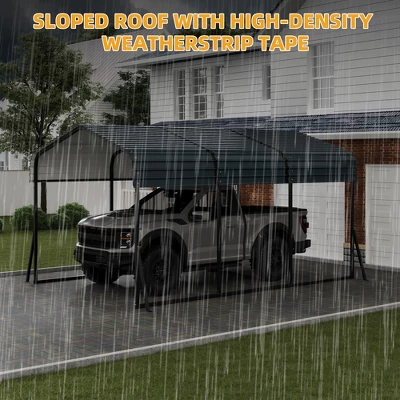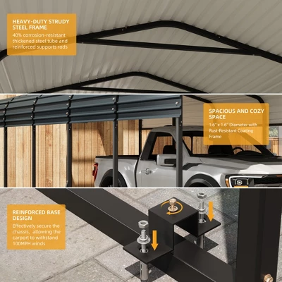 - UPGRADED AND ENHANCED BASE – To ensure stability, the metal carport is furnished with heavy-duty anchor rods and offers 4 reinforcing support rods that can be installed on various surfaces, ensuring remarkable stability and durability even in adverse weather. The car port metal roof is made of galvanized steel, which is rust-resistant and highly durable. The upgraded sloping canopy facilitates rapid water drainage.