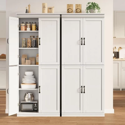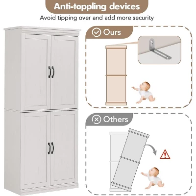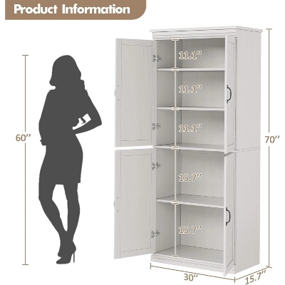 Product DescriptionPantry Cabinet, Freestanding Kitchen Pantry Storage Cabinet,70″ Cupboard, Tall Storage Cabinet with Doors and Adjustable Shelves, for Bathroom, Dining Room, Living Room, AntiqueSpecial place for bottles6 tiers of shelves with 3 tiers on each side of the door help you organize various items such as jams, seasonings, and drinks.Durable hingesTo enhance stability and safety, we utilize three hinges on every door to accommodate heavier loads.Adjusable shelfYou have the flexibility to easily adjust the lower shelf to different heights, allowing you to accommodate larger-sized objects with ease.Sturdy baseAn arch design not only enhances the aesthetic appeal but also increases the overall stability and robustness of the cabinet.Golden handleThe 5 luxurious golden aluminium handles give off a sleek and modern vibe, adding a touch of elegance to any space.Smooth drawerCreate a functional space to neatly store your towels, tableware, and plates.Display cabinet ideaUnleash the potential within by opening the doors to reveal a stunning display cabinet. With its wood-pattern desktop and spacious door shelf, transform it into a wine display cabinet, a cosy coffee station, or anything your heart desires.Product informationColorAntique White / GreyProduct Dimensions15.7″D x 30″W x 70″HPackage Dimensions40″D x 19″W x 13″HSpecial FeatureAdjustable ShelfMounting TypeFloor MountRoom TypeDining RoomDoor StyleFlat PanelIncluded Components1 x Storage Cabinet, 1 x Assembly Guide, 1 x Installation ToolItem Weight95 PoundsAssembly RequiredYes