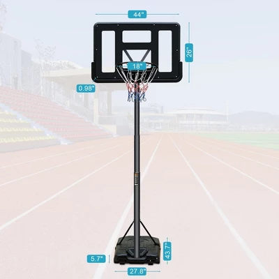 - 【Item Size】Backboard size: 41.7″ x 26″ x 0.98″ (L x W x H), adjustable height: 6.6ft – 10ft, base size: 43.7″ x 27.8″ x 5.7″ (L x W x H), basket diameter: 18″.