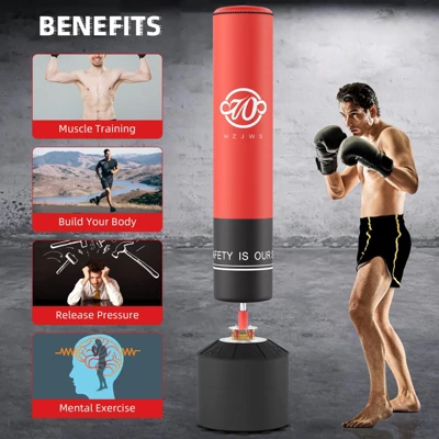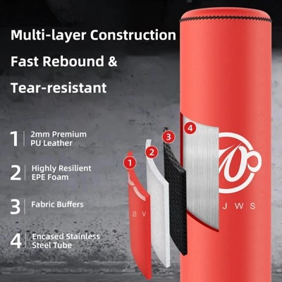 - High-quality Inner and Outer Materials: The boxing bag is made of high-resilience PU leather, highly resilient EPE foam, power buffer layer, and stainless steel tube. High resilience, tear resistance, and durability. While enjoying boxing, it can minimize sports injuries.
