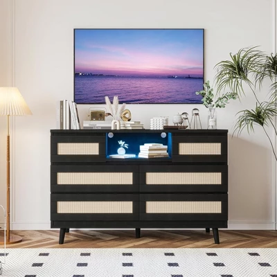 - 【Multi-Variable RGB Lights & Power Outlets】 The dressers for the bedroom have beautiful multi-color RGB LED light; the colors and brightness can be controlled by a button and APP. This bedroom dresser with drawers will create a beautiful ambiance in a dark environment. This tall rattan dresser with drawers equipped with 2 USB ports, and 2 AC outlets, supports handy charging of multiple devices, such as cell phones, tablets, and laptops, providing convenient charging solutions for your life.