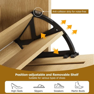 - [ More Thoughtful Designs ] – The bottom space can hold slippers or a sweeping robot and the 360° adjustable metal legs make the cabinet stable even on uneven floors. The top fence keeps items like plants, ornaments, socks, and keys safe from falling. The hooks on both sides can be used to store umbrellas or shoe horns. The unique silent cotton design ensures no noise when opening and closing the cabinet doors. Despite its narrow size, this shoe cabinet has complete and powerful functions.
