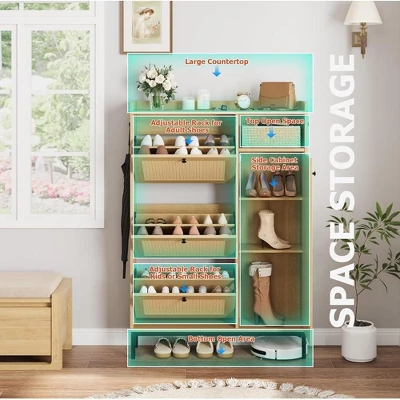 - [ Flip Drawers Shoe Cabinet ] – This modern standalone shoe cabinet features a sleek and stylish design that seamlessly blends with various home styles. The spacious interior easily accommodates different types of shoes. Additionally, the compact structure helps save space, making it an ideal choice for entryways or bedrooms, keeping your shoes neatly organized. The bottom flip drawers are specifically designed for children’s shoes to help instill organizational skills.