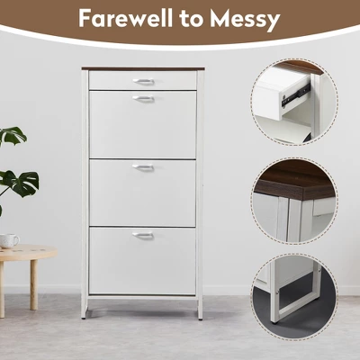 - Color Options: Available in elegant White and Rustic Brown finishes, this shoe cabinet is designed to effortlessly complement any entryway, living room, dressing room, or primary living space.