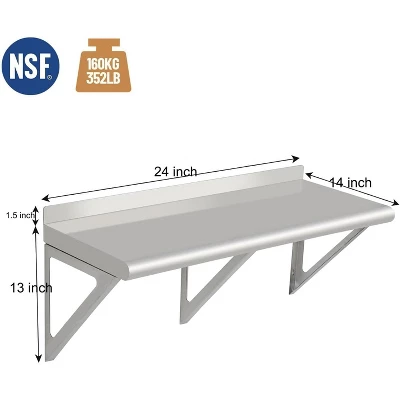 Product detailsThe Stainless Steel Wall Shelf is a premium storage solution designed to take your kitchen organization to new heights.This expertly crafted metal shelving unit features a sleek curved edge design that adds a touch of modern sophistication to your cooking space.Designed with durability in mind, this heavy-duty shelf is made from high-quality stainless steel to add a long-lasting, decorative touch to your kitchen. The Stainless Steel Wall Shelf is a commercial-grade product suitable for both residential and commercial settings, able to stand up to the demands of a busy kitchen environment.The wall-mounted feature allows you to maximize floor space while keeping your essentials within easy reach. Whether you’re a professional chef or a home cook, this NSF-certified shelf ensures your storage meets the highest standards of safety and sanitation.