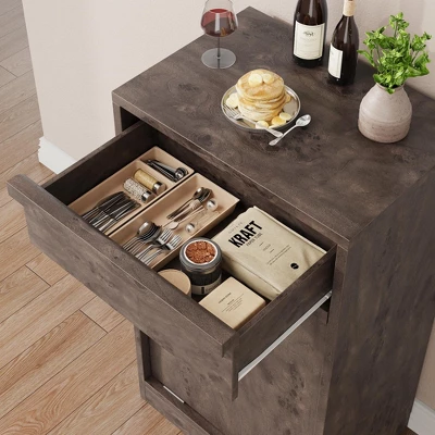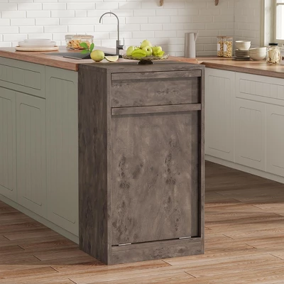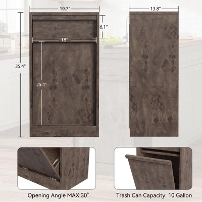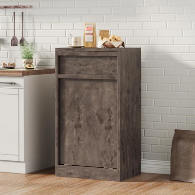 - EASY TRASH DISPOSAL DESIGN – The tilt-out feature of this trash cabinet allows for effortless waste disposal. By simply tilting the front panel, you can easily access and dispose of trash, eliminating the need to lift heavy garbage bags or bins. The pull-out drawer and spacious tabletop offers additional storage space for recycling bins or cleaning supplies