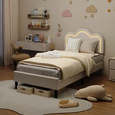 Product DescriptionThis bed frame features multiple modes such as music, microphone, and timer, allowing you to create your ideal bedroom ambiance. You can adjust the colors, brightness, and modes through a mobile app or remote control, which not only creates an enchanting atmosphere in your bedroom but also serves as a night light.The headboard is made of soft-to-touch PU leather, have a better skin touch. Breathable high-density sponge padded on the headboard ensures long-lasting comfort and support for young children while sitting up to read or play games.The bed frame’s 2 footboard drawers offer ample storage space, equipped with bottom wheels for easy pulling in and out when storing items like spare bedding, ensuring your room stays clutter-free. Product informationSizeTwinProduct Dimensions78.7″L x 39″W x 46″HSpecial FeatureLotus Headboard & Footboard DesignColorBeigeFinish TypePUIncluded ComponentsAdjustable Headboard, Drawer, Rails, Wood SlatsGround To Item Distance9 InchesProduct Care InstructionsWipe with Damp ClothAssembly RequiredYes