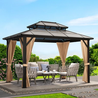 10x12ft Hardtop Gazebo, Aluminum Frame Pavilion with Curtains and Netting, Sunshade for Garden, Patio, Lawns