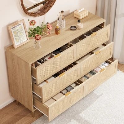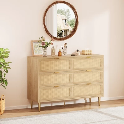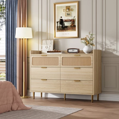 Transform your space with this elegant rattan 6 drawer dresser, where farmhouse charm meets modern functionality. Enjoy ample storage and effortless style, making organization a breeze in any room. Highlights as a glance: A wood grain surface and stylish rattan panels bring warmth and a tactile element to your decor. Thick engineered wood resists moisture and temperature changes, minimizing the risk of cracking and warping. 5 sturdy metal legs ensurew reliable stability while adding a modern touch. 6 spacious drawers provides ample storage for clothes, accessories, and personal items. The wide double drawer design enables easy organization, and soft-close hinges provide quiet closure¡ªideal for homes with kids or pets¡ªwhile sturdy metal construction boosts durability and longevity. Waterproof surface ensures easy maintenance, allowing for a beautiful, clutter-free environment. Suitable for any setting, including the nursery, bedroom, living room, dining room, or entryway. Specification: Size: 42.52×15.55×29.53 inches Color: natural / white Material: engineered wood+metal+rattan Friendly note: Please tighten the screws after all the part are placed in their position. Packing list: 6 drawer dresser x1 Hardware bag x1 Assembly guide x1