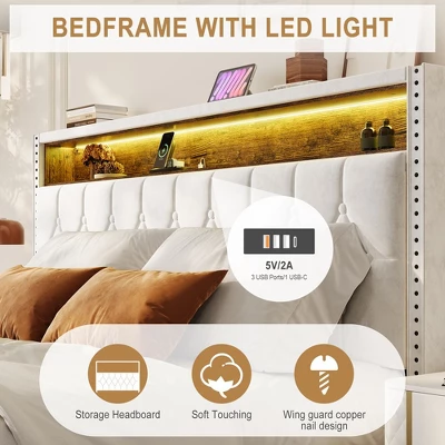 - 【Storage Upholstered Headboard】The headboard of this white velvet bed frame with headboard lights features storage space for glasses, phones, and other small items. There is storage space under the led bed frame, which can also be used to store infrequently used items to optimize space.With extra height of headboard and width of wingback, not only can you place your mobile phone on the headboard, but also protect the mattress from moving.