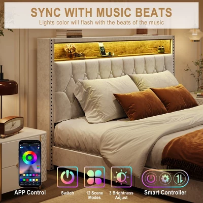 - 【LED light & Charging Station Headboard】With multiple colors of led lights and modes for adjustment, this led light can be controlled by app and create a nighttime atmosphere for your bedroom.Built-in 1 Type-C and 3 USB fast charging ports keep your cell phone, tablet, Bluetooth stereo, afnd other electronic devices always online without an outlet. All is convenient for your life.